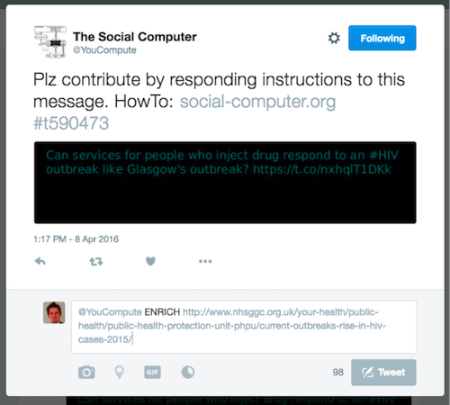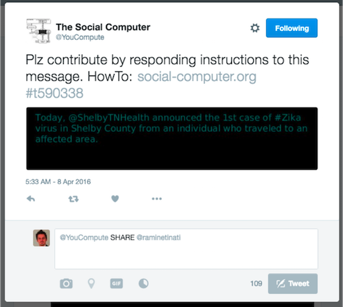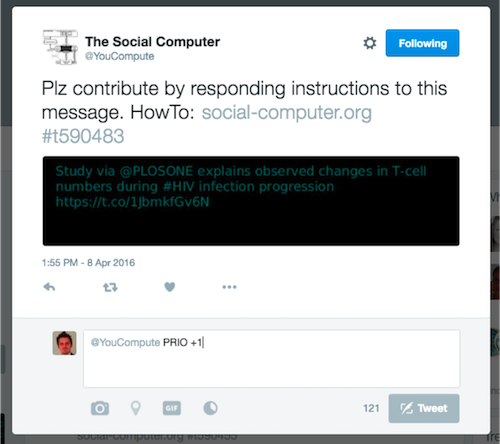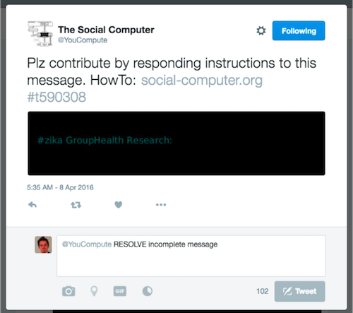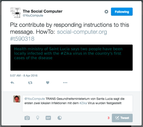 The Social Computer supports a set of fundamental instructions. By responding with these instructions and your additional input to messages the Social Computer sends out via Twitter or facebook the users shape the algorithms the Social Computer runs.